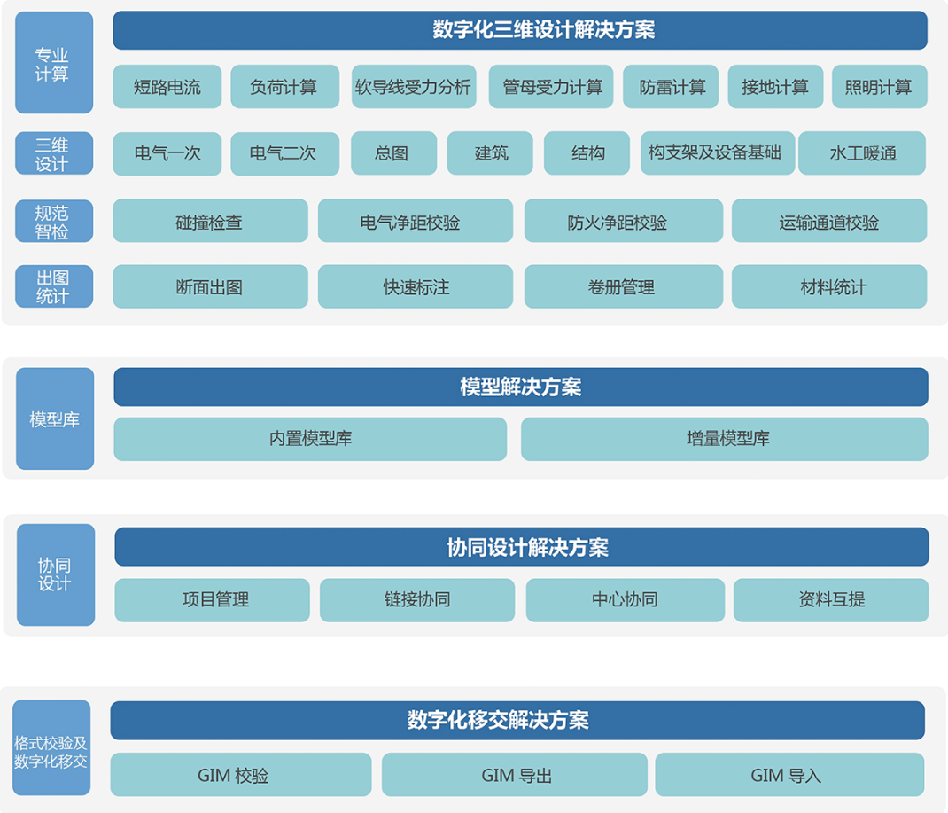 平台主要由三维建模系统、出图管理系统、设备管理系统、项目管理系统、协同设计系统、平台配置系统六大部分组成,分别对电气、土建、水暖、线路等专业提供了快速建模、专业计算、碰撞检查、材料统计、标注出图等功能,三维设计成果符合国网公司三维数字交付标准。